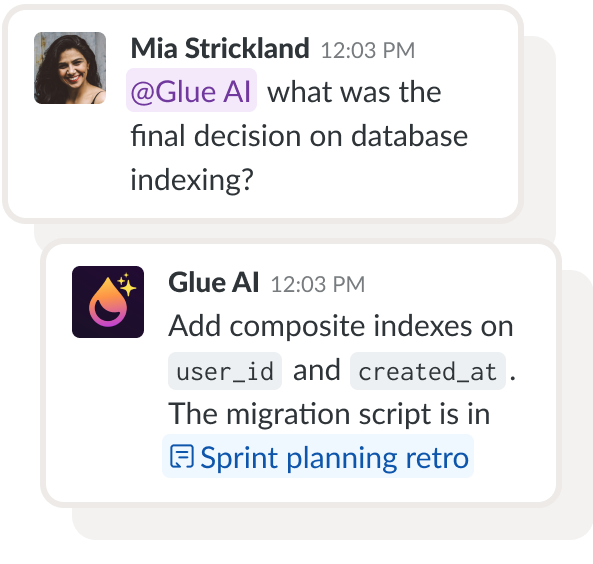 Glue AI is your team’s personal agent. It has full context of your threads and docs, is customizable to your preferred model and tone, and can be used 1:1 or multiplayer with your team.